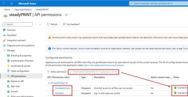 Als nächstes sind die Berechtigungen „Files.ReadWrite.All“ und „User.Read“ vom Typ „Delegated“ für den Zugriff auf die API durch steadyPRINT zu hinterlegen. Dafür sind die o.g. Berechtigungen als Administrator zu hinterlegen und mit „Grand admin consent for […]“ zu bestätigen, sodass diese mit „Granted“ bestätigt worden sind.