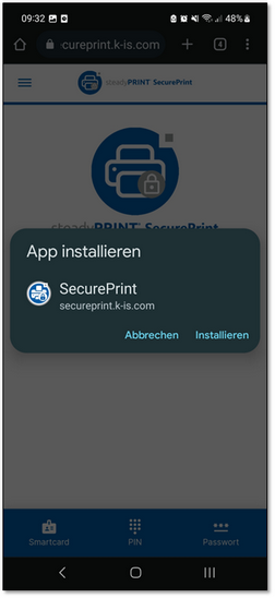 When the link to the SecurePrint App is called up (whether Printer Terminal or BYOD device), the user has the option to always access the app in the browser or to install the app (Progressive Web APP – PWA) in the smartphone and to use it as a normal app. Shortly after calling up the app the message Add SecurePrint to Home Screen will be displayed at the bottom of the screen (see left figure). If the user clicks this message, SecurePrint can be installed as an app (see right figure). A custom icon will then be created so that the SecurePrint App can always be accessed.